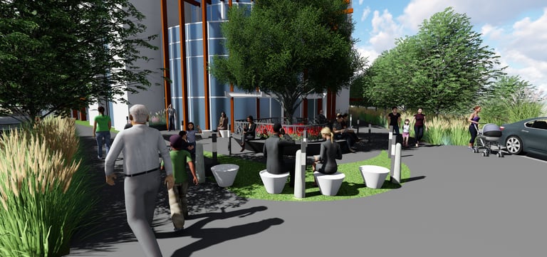 The building has passive energy savings green elements such as a cool roof topping, overhangs, dual-glazed windows, solar panels on the top, green spaces all around The building, and electrical vehicle charging stations.